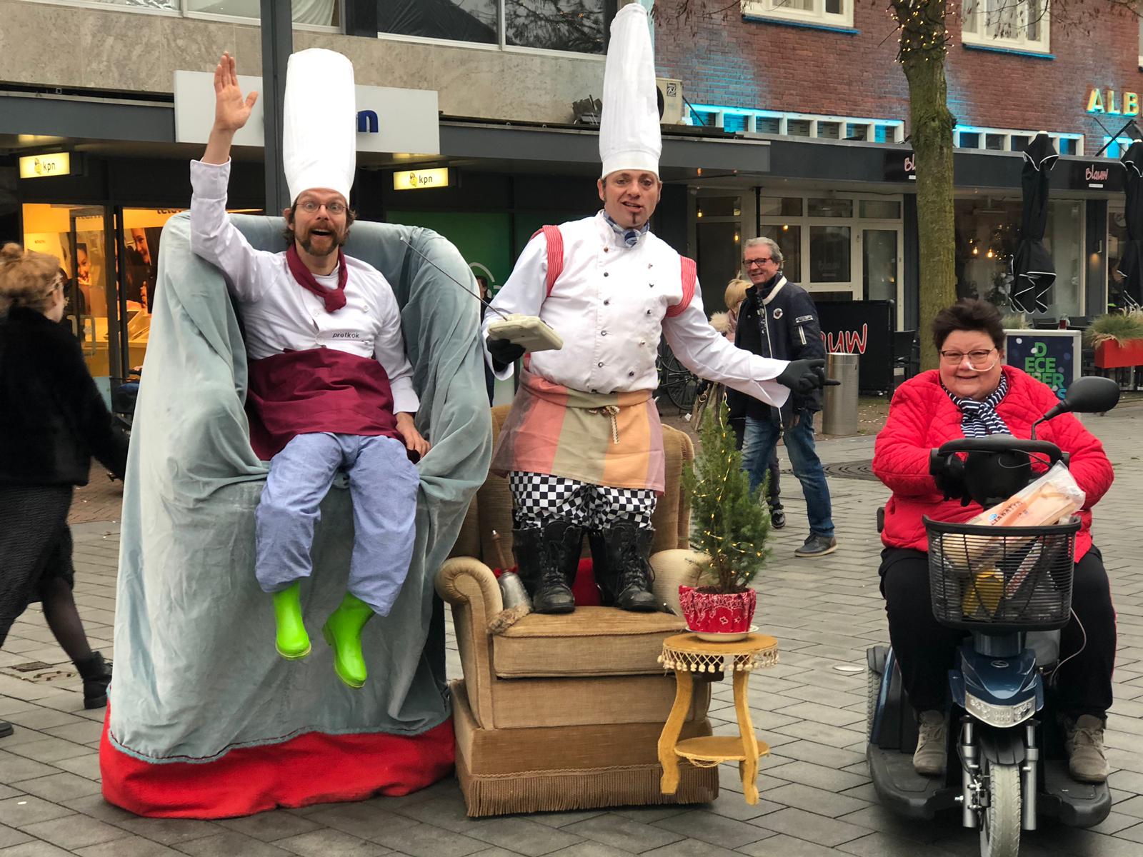 Maar goed ik rij nu een 3 weekjes rond in dat ding. Je trekt er wel de aandacht mee. De sonde in mijn neus, dat karretje wat aangeeft dat je toch wel invalide bent vraagt om een blik…och zij ook al, ze is nog zo jong. Maar als je dan over de drempels heen stapt en je gaat door de Stationstraat richting huis zie ik daar een bekende staan…die eigenlijk oliebollen moet uitdelen maar die waren er even niet. Direct komen de theatrale kunstenaars naar mij toe, gevolgd door de zingende bakkers. en ineens zit ik in alle aandacht. dat heb ik als ik sta nooit….. even later sta ik nog wat te kletsen met andere en hupsakee, daar zijn de aandachtsgevers weer en word ik toe gezongen… vrij snel daarna zie ik dezelfde theater mensen de volgende toezingen..in een scootmobiel en achter een rollator….. ach ja. ik moet de voordelen nog wat meer gaan benadrukken dan word ik vast gelukkig met dit karretje,,,,ik sta zo wel vaak in de ongevraagde aandacht én ik kom in ieder geval heel wat vaker buiten dan de laatste maanden.