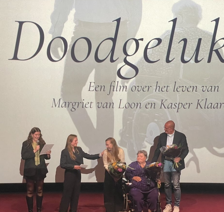Afgelopen donderdagavond werd in de Pathé-bioscoop in Tilburg de documentaire Doodgelukkig vertoond gemaakt door Lieke Potters en Marieke Hanegraaf, twee studenten van Fontys Hogeschool. Een documentaire over palliatieve zorg, maar vooral over het leven zélf. Ze hebben uit uren opname materiaal de essentie weten te raken, zo knap van ze.